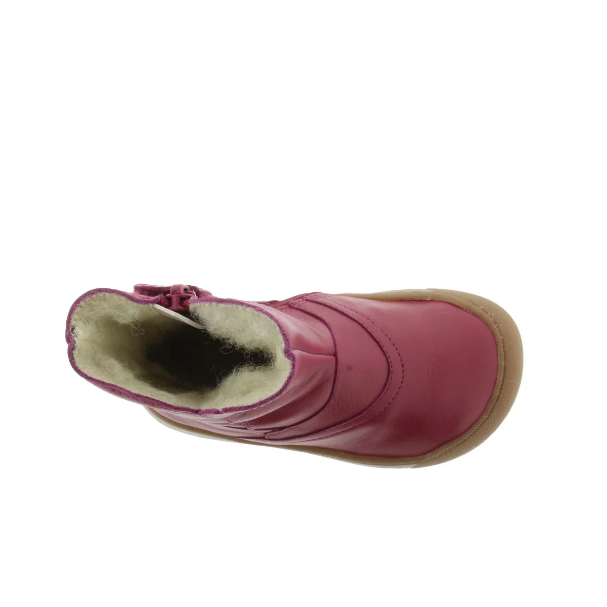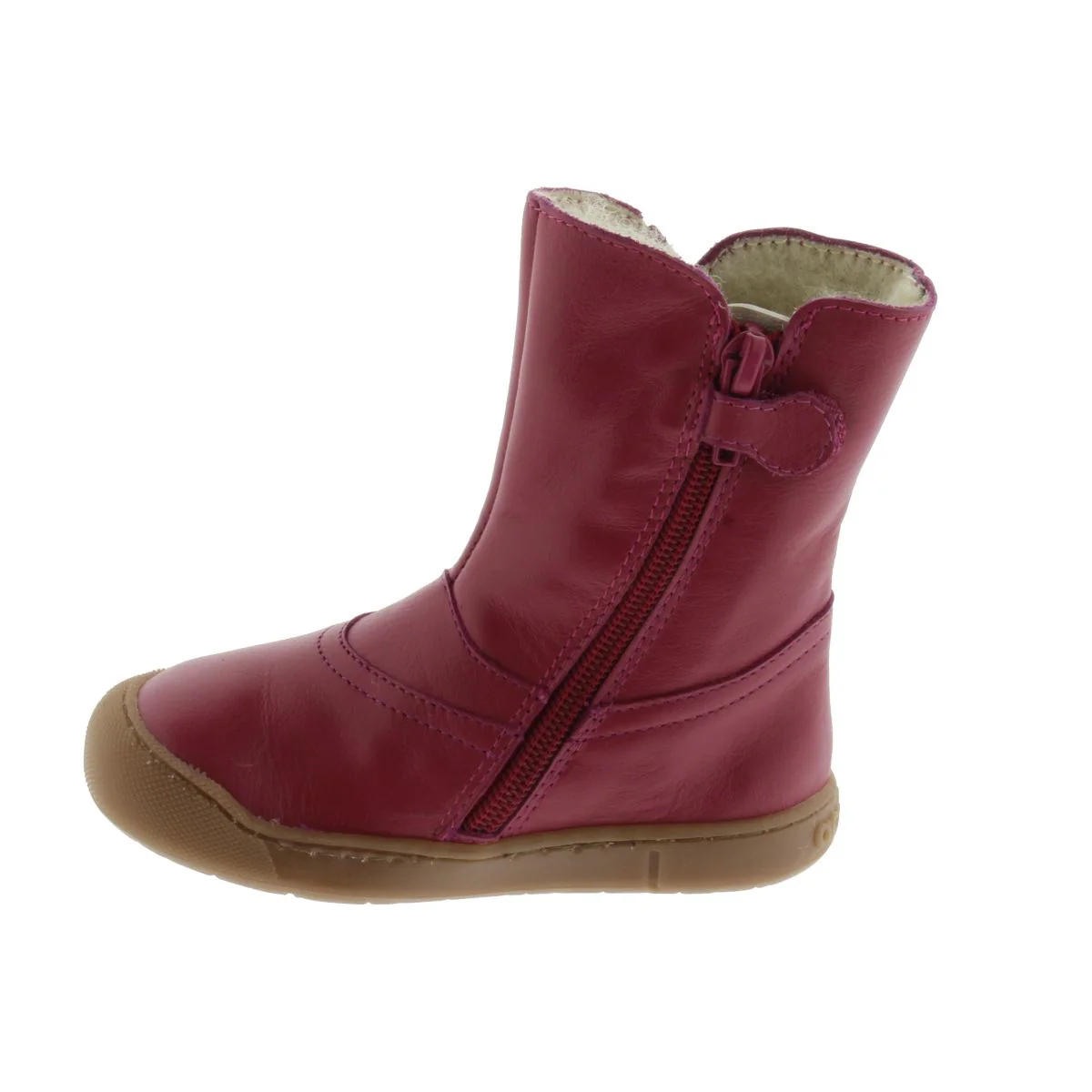 Dessus : cuir Couleur : prune Semelle intérieure : laine Doublure : laine Système de fixation : fermeture éclair Semelle extérieure : caoutchouc Usage : utilisation en extérieur – Le bout est protégé par du caoutchouc mais n’apprécie pas des frottements intenses comme avec une draisienne qui pourraient abîmer le cuir.