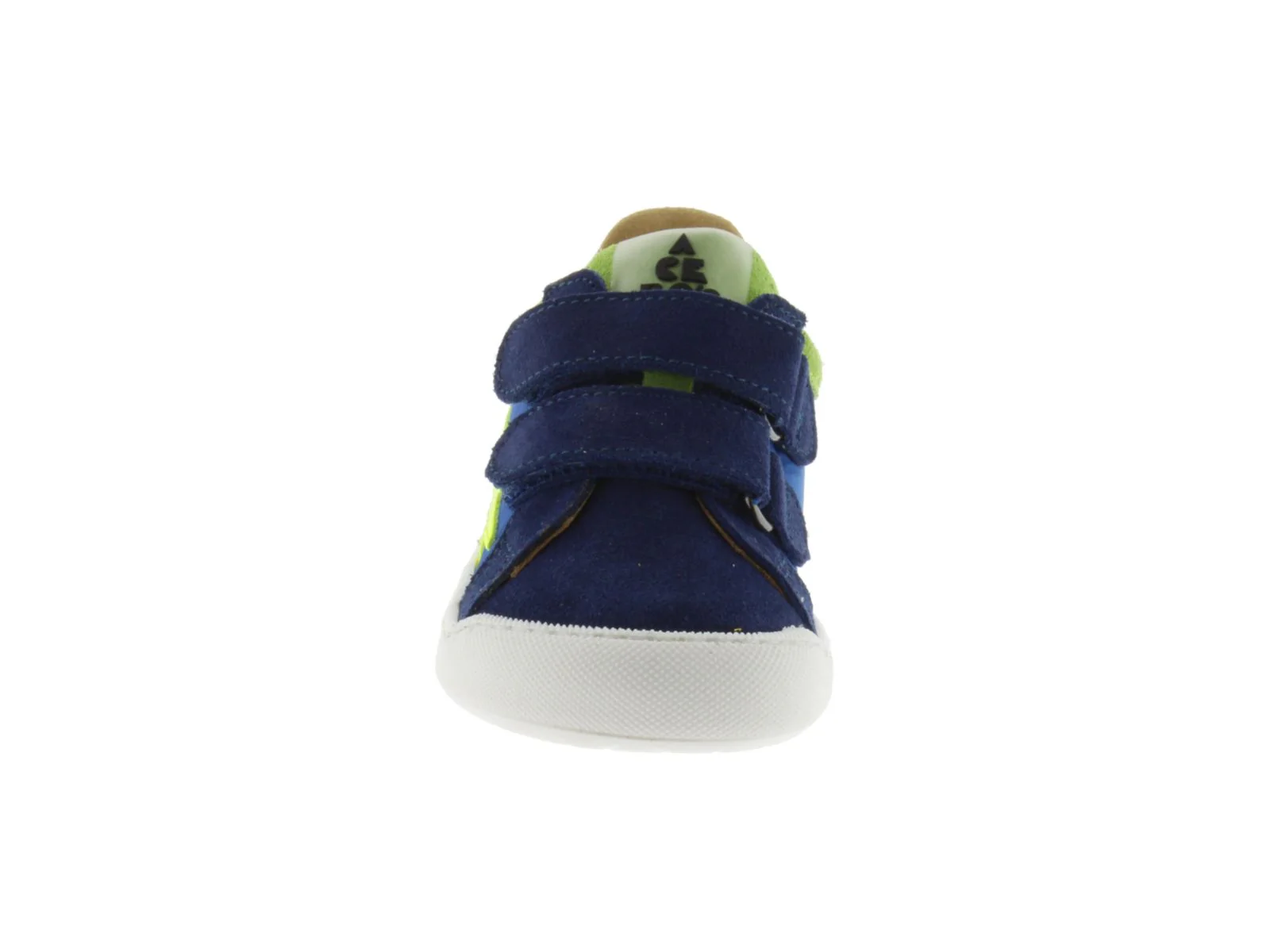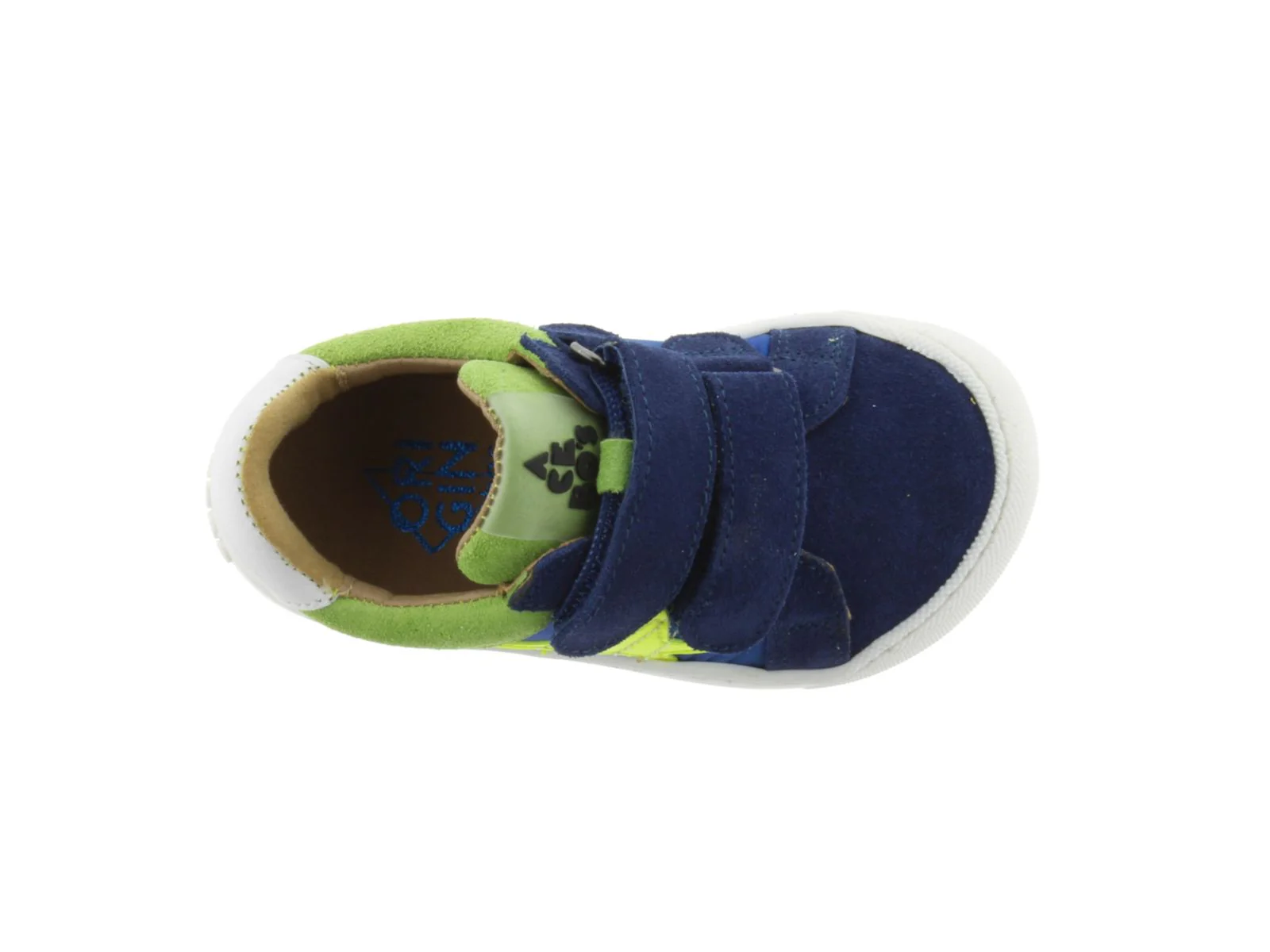 Dessus : cuir et textile Couleur : marine, vert, étoile jaune fluo Semelle intérieure : cuir Doublure : cuir Système de fixation : deux scratchs Semelle : caoutchouc recyclé Usage : utilisation en extérieur – Des frottements intenses comme avec une draisienne pourraient abîmer le cuir.