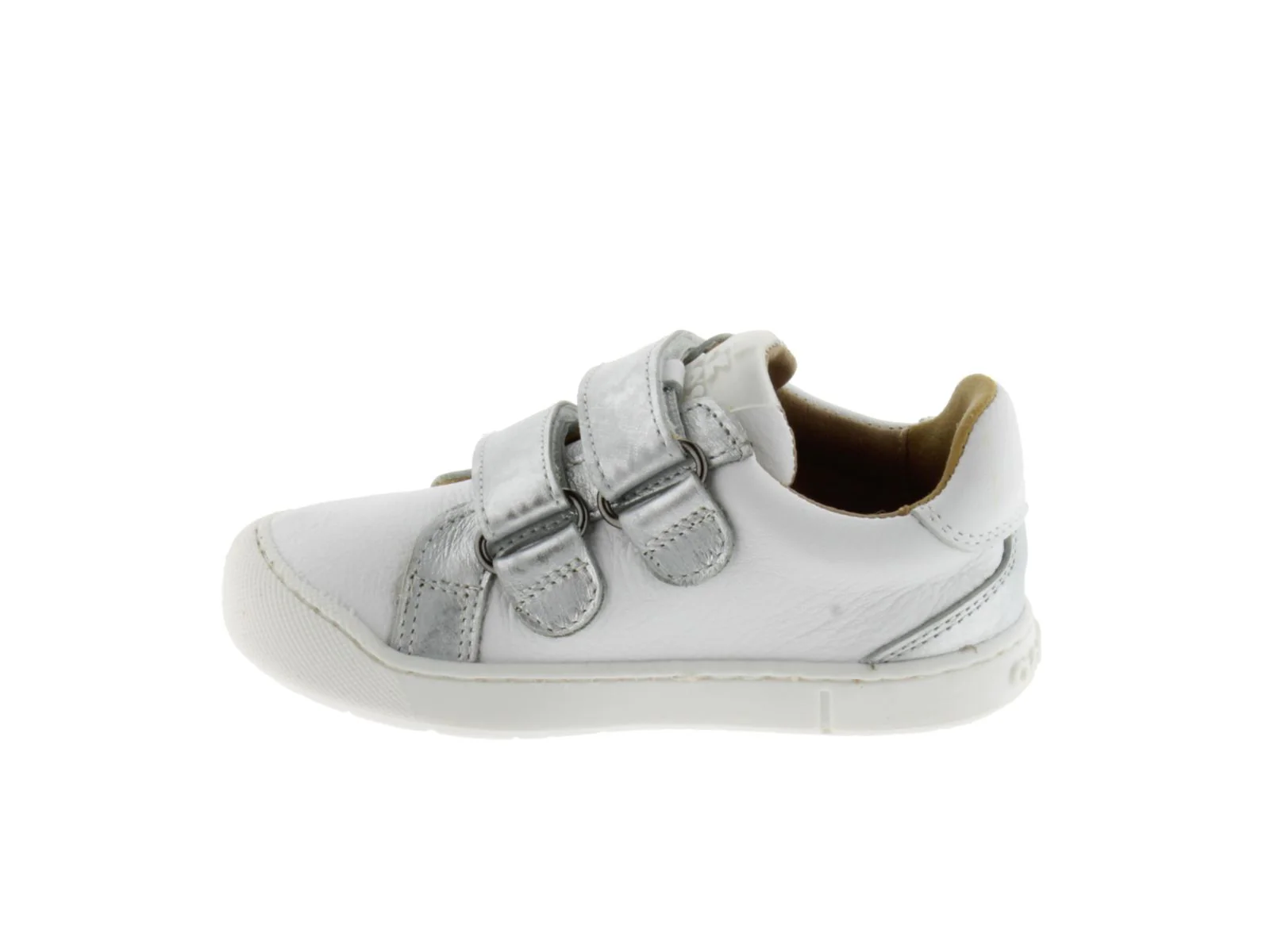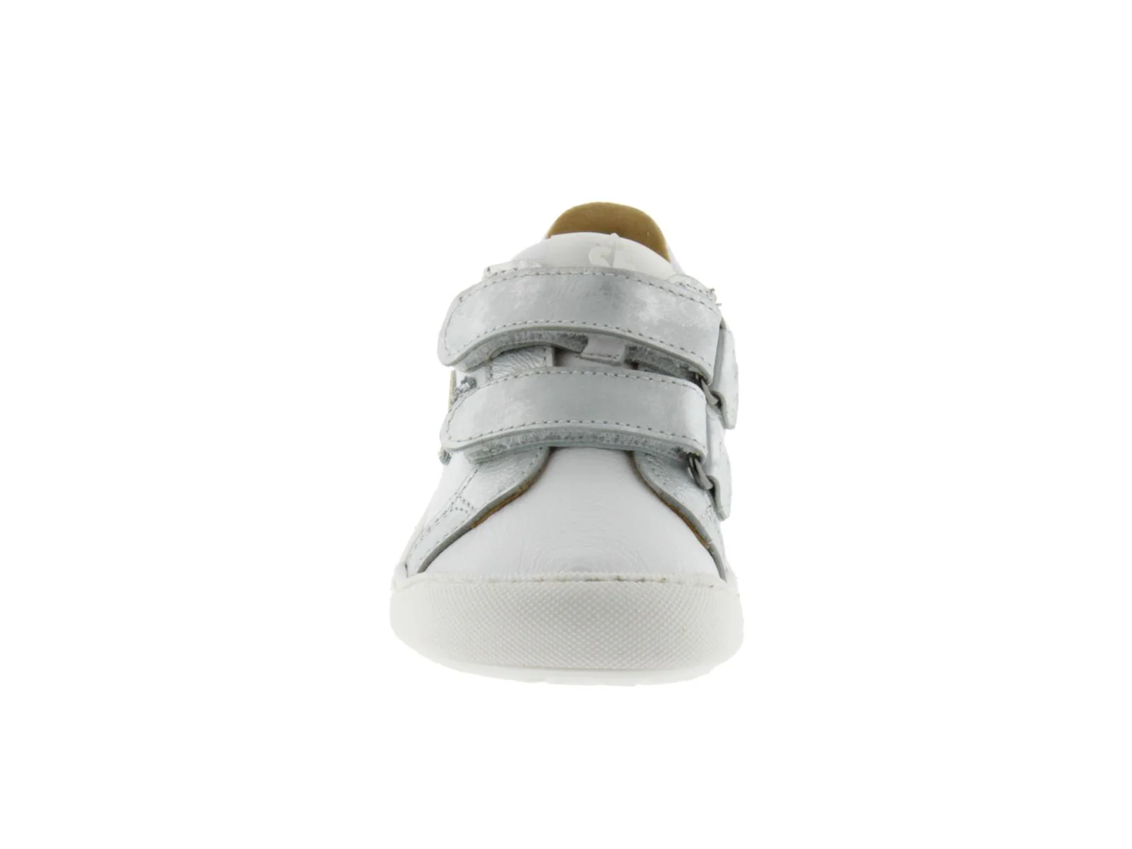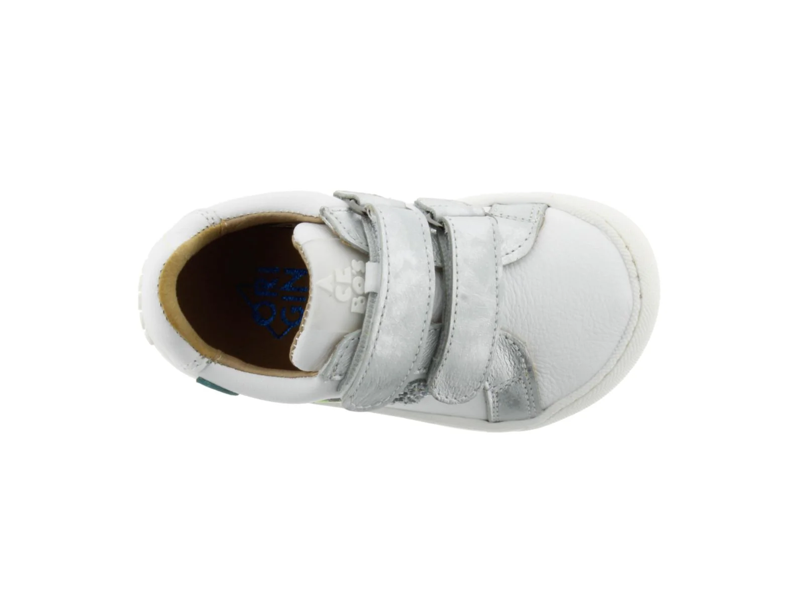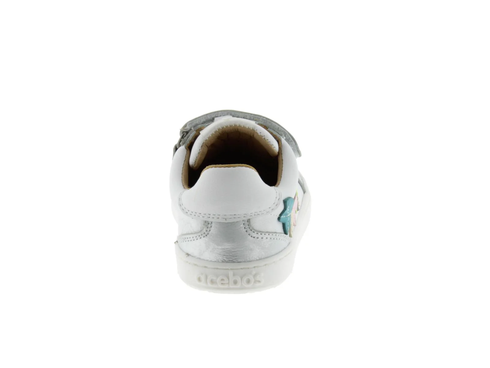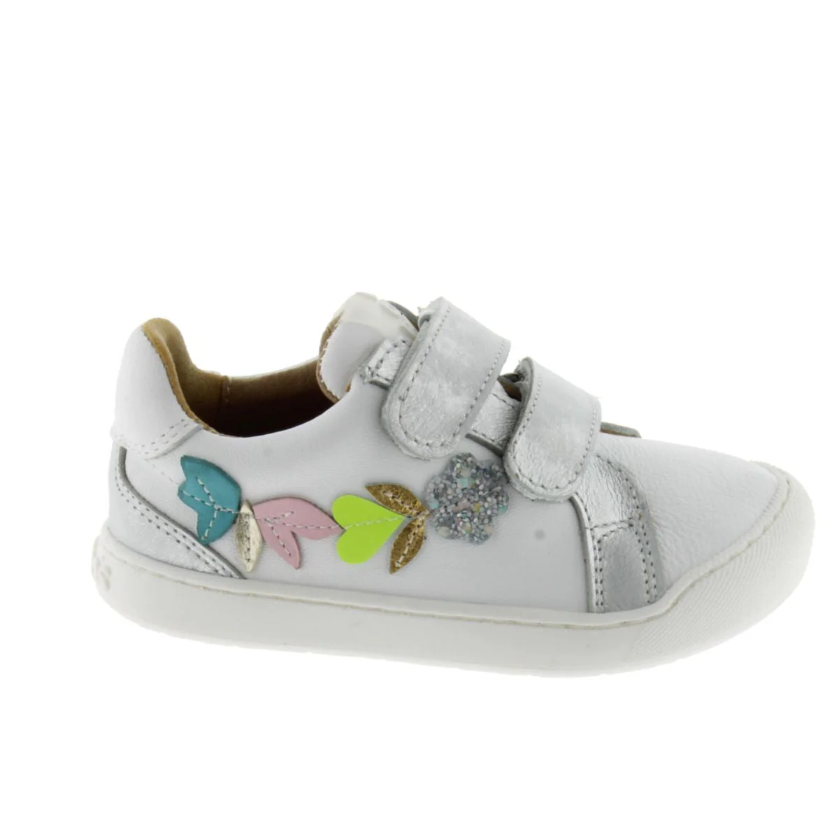 Dessus : cuir Couleur : blanc et argenté avec ornement de fleurs et paillettes Semelle intérieure : cuir Doublure : cuir Système de fixation : deux scratchs pour un ajustement facile Semelle : caoutchouc recyclé Usage : utilisation en extérieur – Des frottements intenses comme avec une draisienne pourraient abîmer le cuir.
