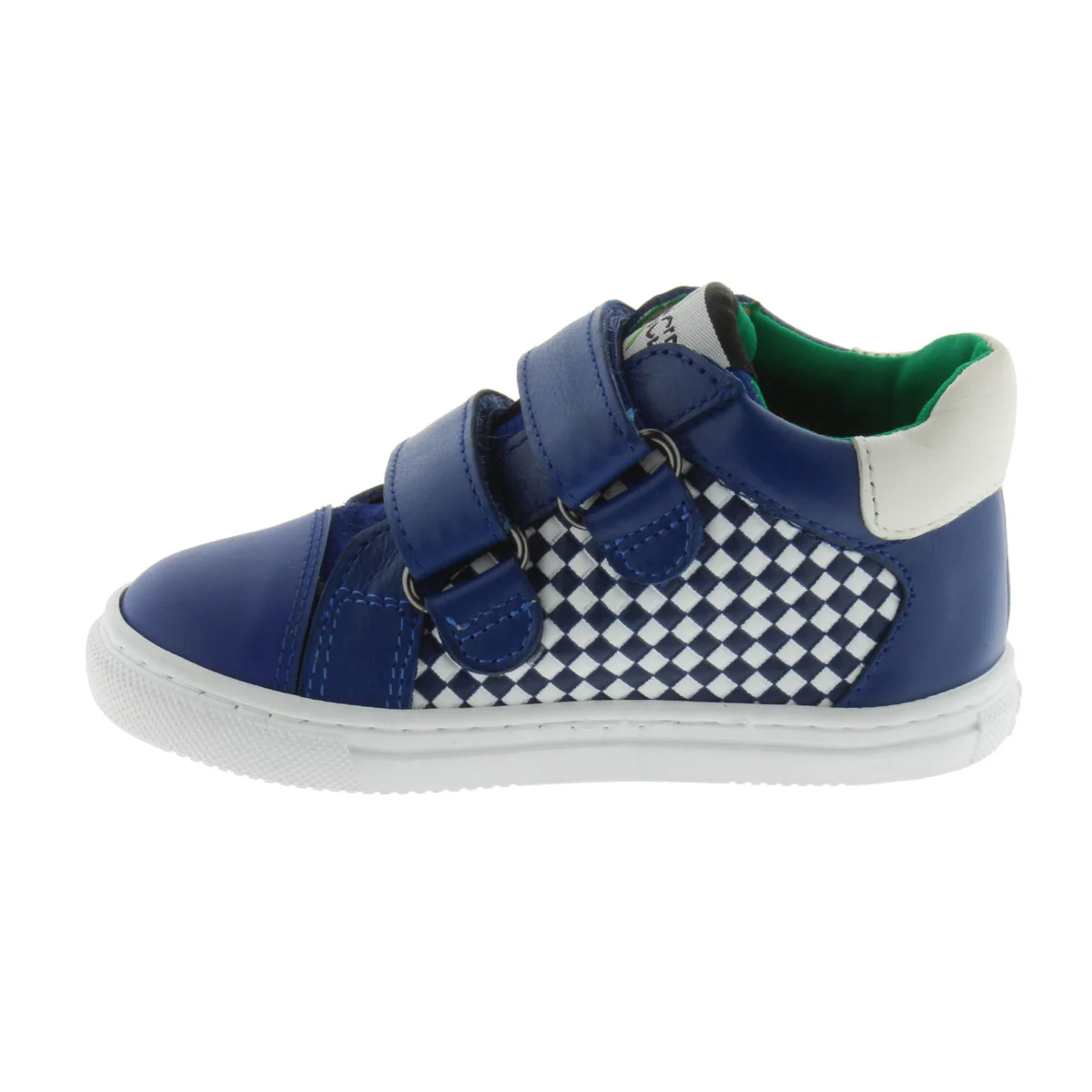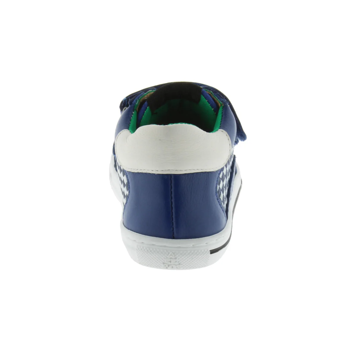 Dessus : cuir et caoutchouc Couleur : bleu à damier et vert à l’intérieur Semelle intérieure : cuir Doublure : cuir Système de fixation : deux scratchs pour les enfiler facilement Semelle : caoutchouc Usage : utilisation en extérieur – des frottements intenses comme avec une draisienne pourraient abîmer le cuir.