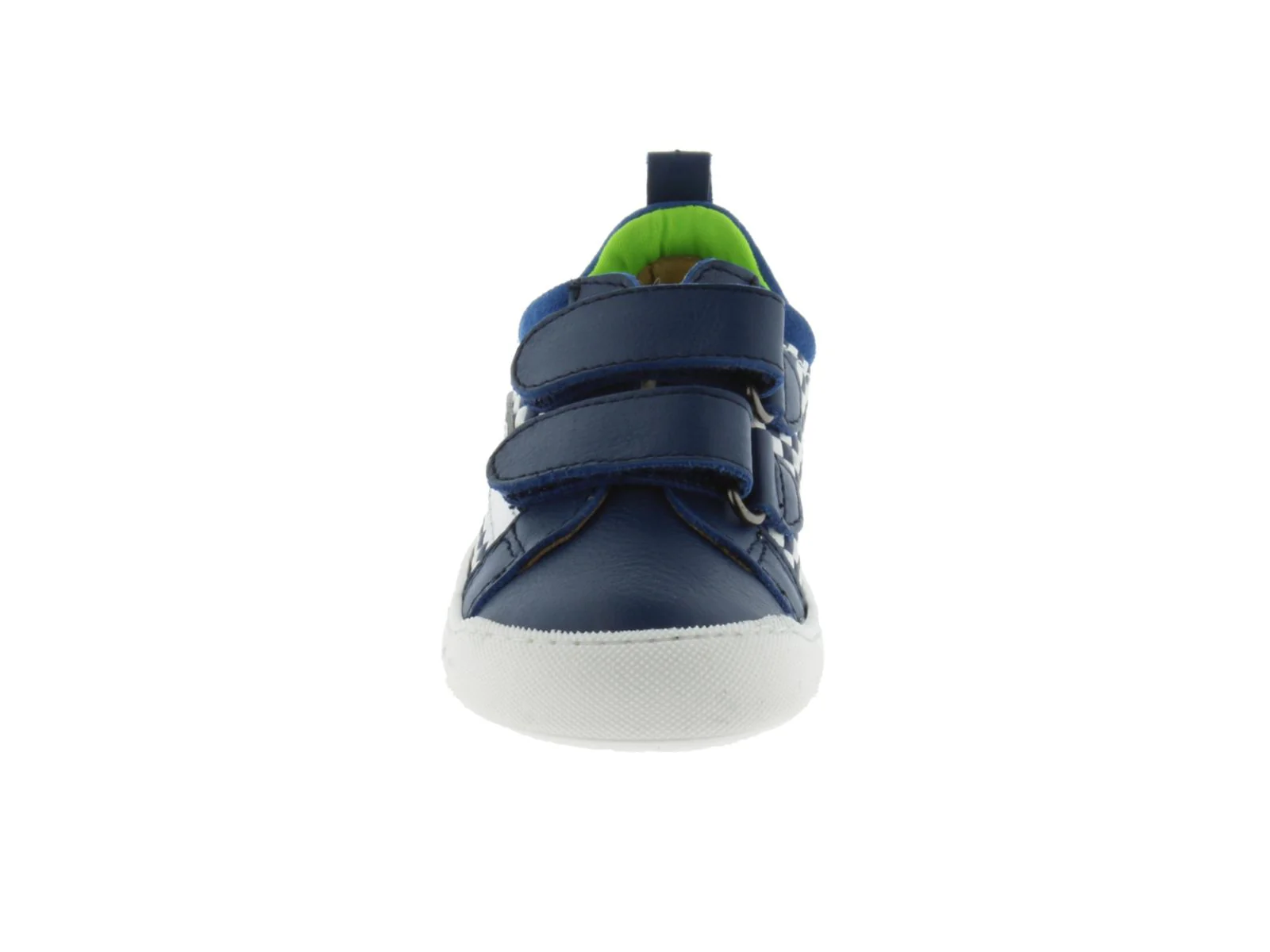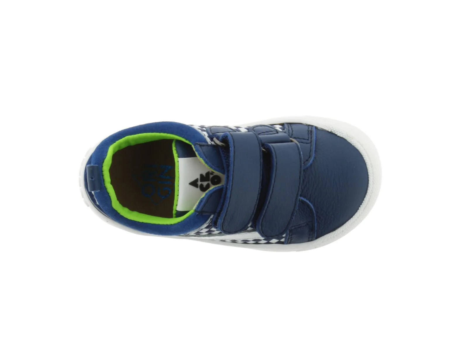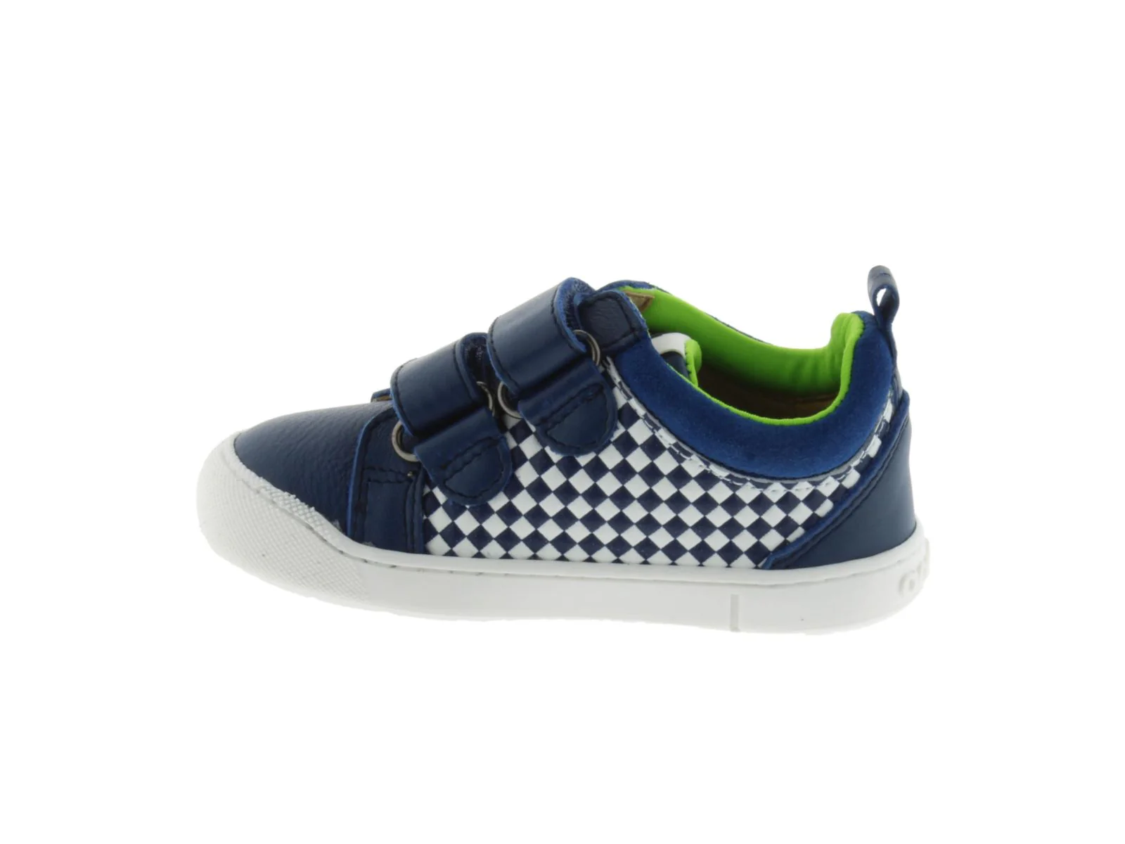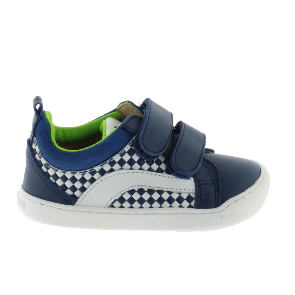 Dessus : cuir et matière synthétique Couleur : marine, vert et damier blanc Semelle intérieure : cuir Doublure : cuir Système de fixation : deux scratchs pour les enfiler facilement Semelle : caoutchouc recyclé Usage : utilisation en extérieur – des frottements intenses comme avec une draisienne pourraient abîmer le cuir.