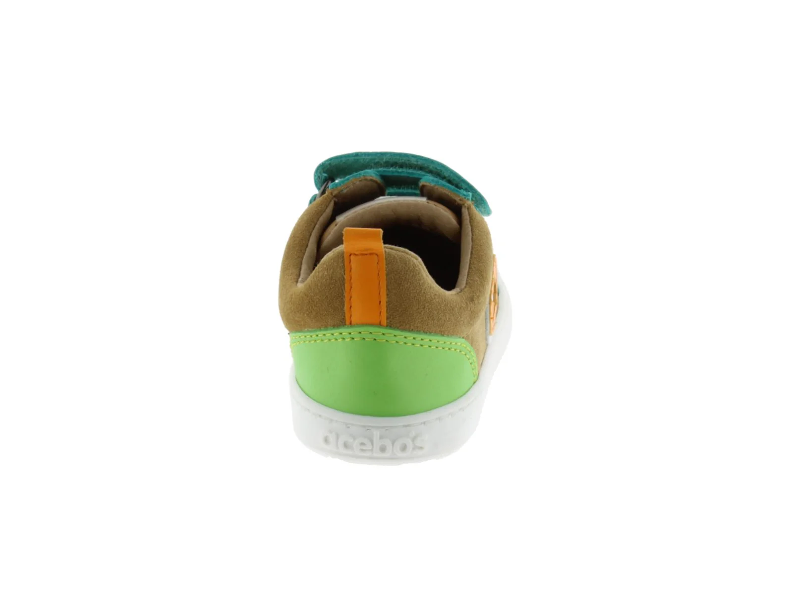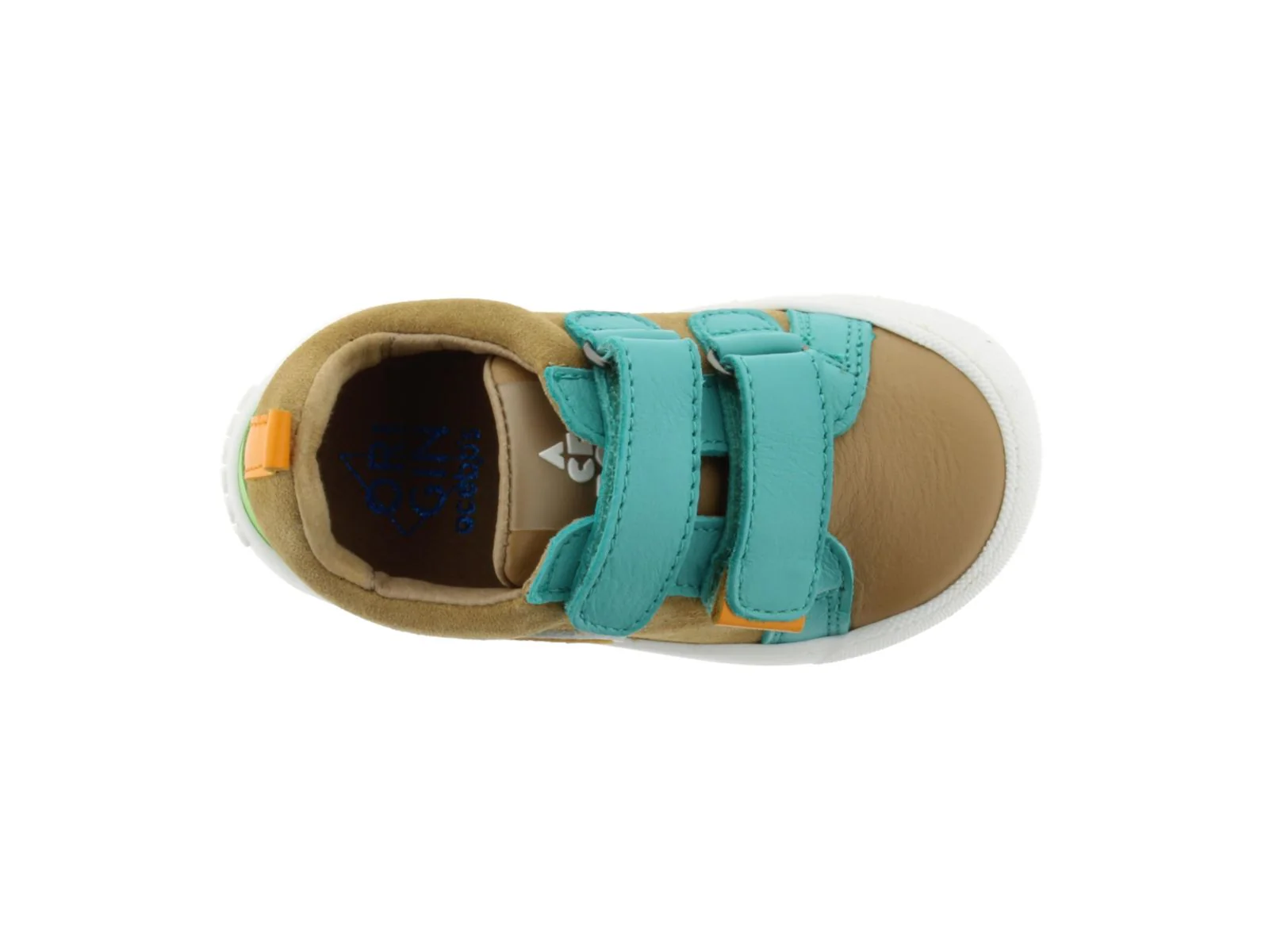 Dessus : cuir Couleur : marron, turquoise, vert, étoile orange Semelle intérieure : cuir Doublure : cuir Système de fixation : deux scratchs pour un ajustement facile Semelle : caoutchouc recyclé Usage : utilisation en extérieur – des frottements intenses comme avec une draisienne pourraient abîmer le cuir.