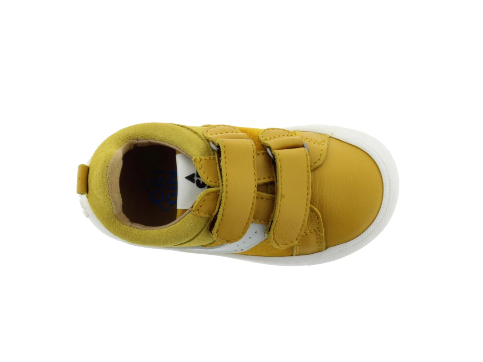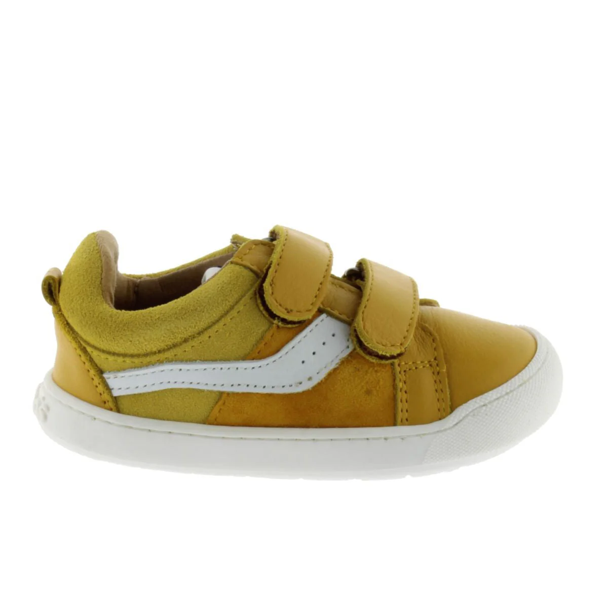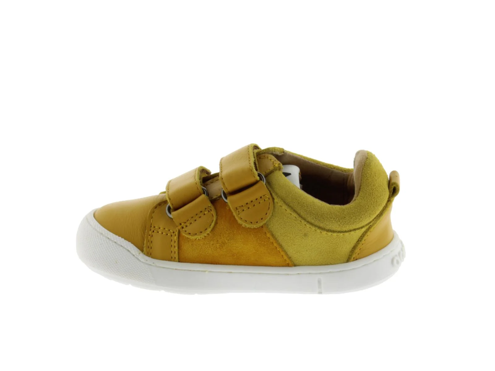 Dessus : cuir Couleur : jaune moutarde et jaune Semelle intérieure : cuir Doublure : microfibre Système de fixation : deux scratchs pour une plus grande autonomie et un ajustement parfait Semelle : caoutchouc recyclé Usage : utilisation en extérieur – des frottements intenses comme avec une draisienne pourraient abîmer le cuir.