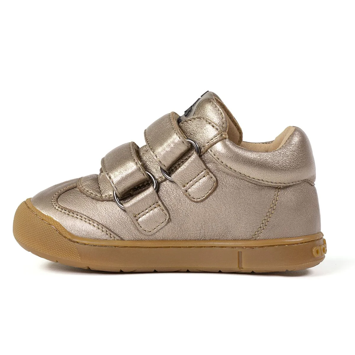 Dessus : cuir Couleur : doré Semelle intérieure : cuir Doublure : cuir Système de fixation : deux scratchs Semelle : caoutchouc recyclé Usage : utilisation en extérieur Des frottements intenses comme avec une draisienne pourraient abîmer le cuir.