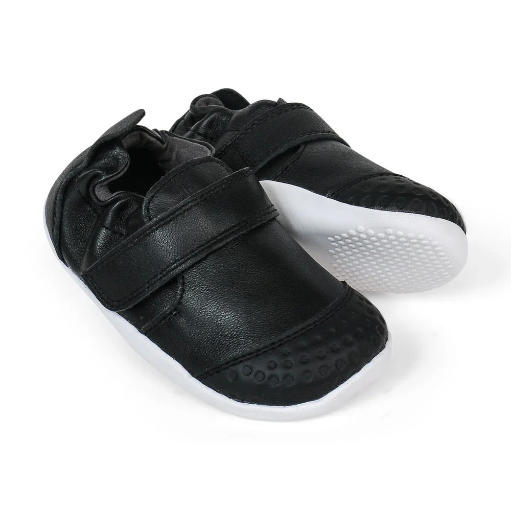 Dessus : cuir nappa et bout renforcé Couleur : noir Semelle intérieure : microfibre Doublure : microfibre polyester Semelle extérieure : EVA Fermeture : facile à enfiler avec son élastique à la cheville et un scratch pour un ajustement parfait Usage : parfaites dès que les enfants commencent à passer de la position 4 pattes […]