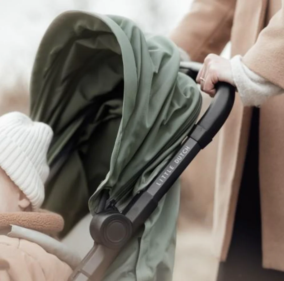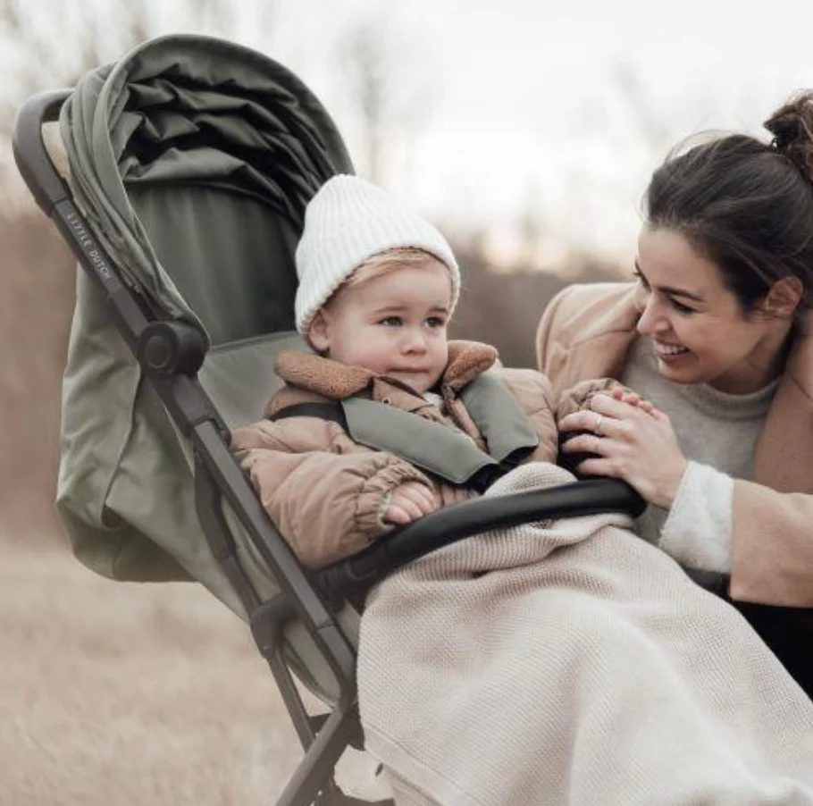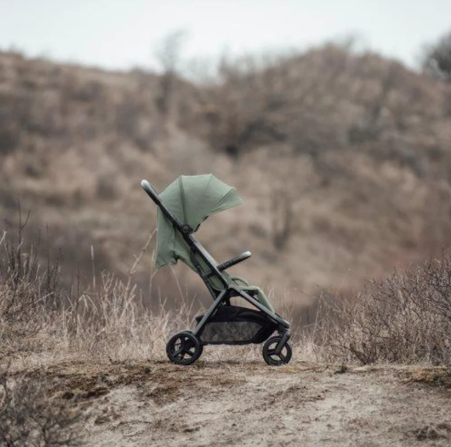 Trois couleurs sont disponibles et se combinent bien avec notre collection Pure : olive, gris et beige. Les dimensions de la poussette pliée sont les suivantes : 58x26x54 cm.