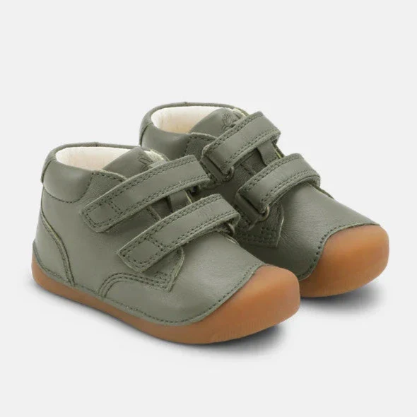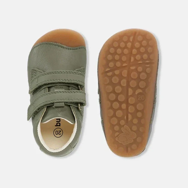 Dessus : cuir certifié Couleur : kaki Semelle intérieure : cuir tannage végétal – amovible Doublure : cuir tannage végétal Système de fixation : deux scratchs pour un enfilage simplifier – les enfants peuvent être autonomes pour les mettre et les retirer. Semelle extérieure : caoutchouc TPR Usage : extérieur