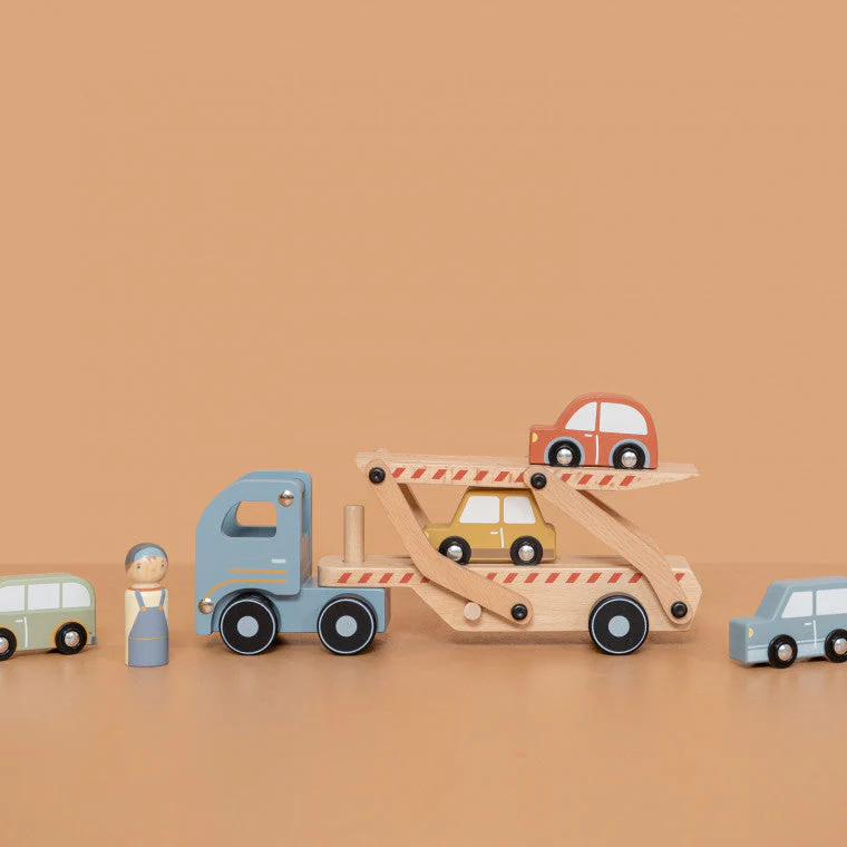Le transporteur en bois de Little Dutch avec sa remorque et ses 4 voitures ne passera pas inaperçu lorsqu’il roulera près de votre petit ! Dépliez la remorque et les voitures peuvent en descendre. Ce camion occupera votre petit pendant un moment et complètera sa collection de voitures à la maison.