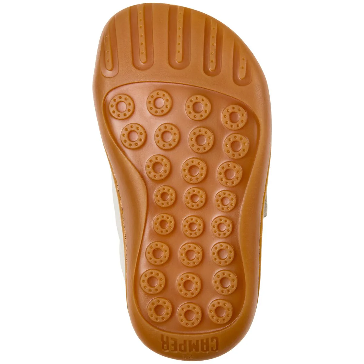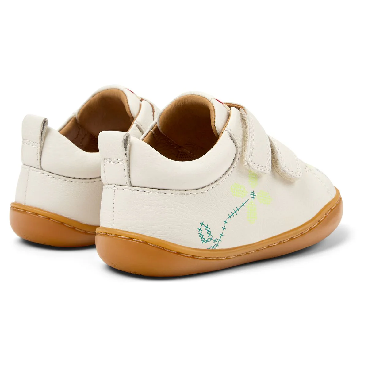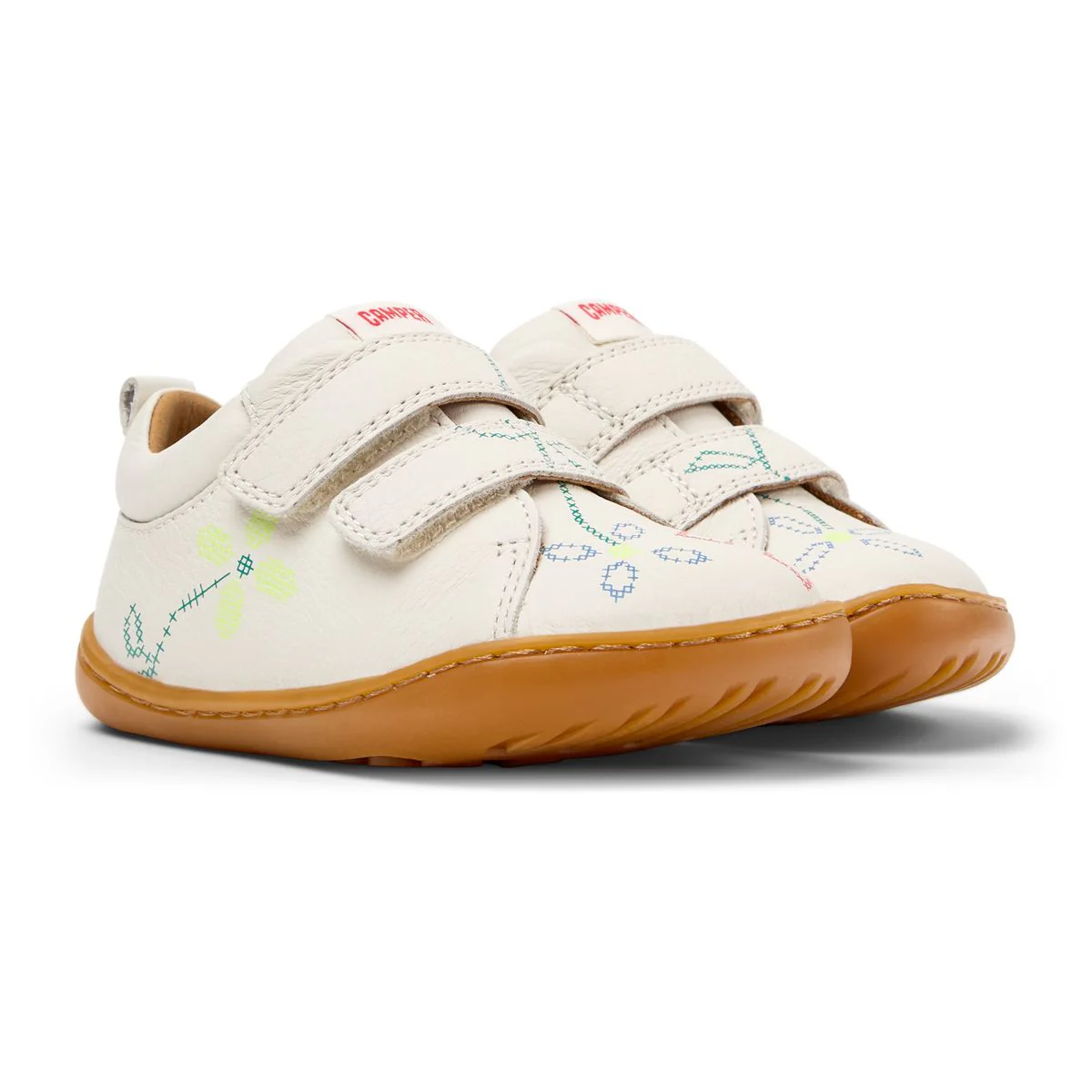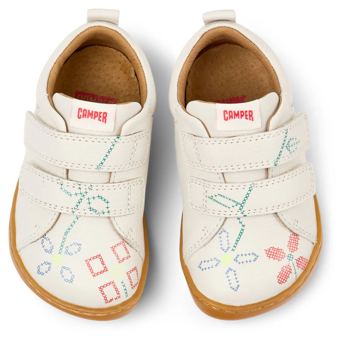 Dessus : cuir Couleur : crème avec broderies multicolores Semelle intérieure : semelle en cuir et amovible Doublure : cuir (57%) et textile (43%) Semelle extérieure : caoutchouc naturel (80%) et recyclé (20%) Fermeture : deux scratchs Usage : utilisation en extérieur Forme ample aux orteils pour un maximum de confort