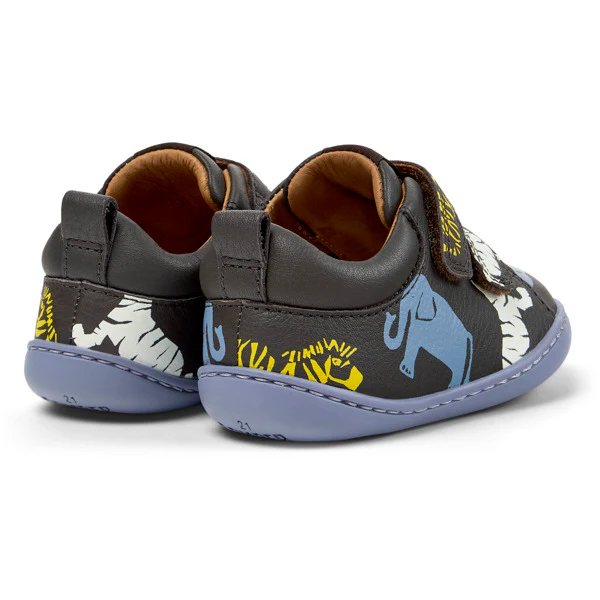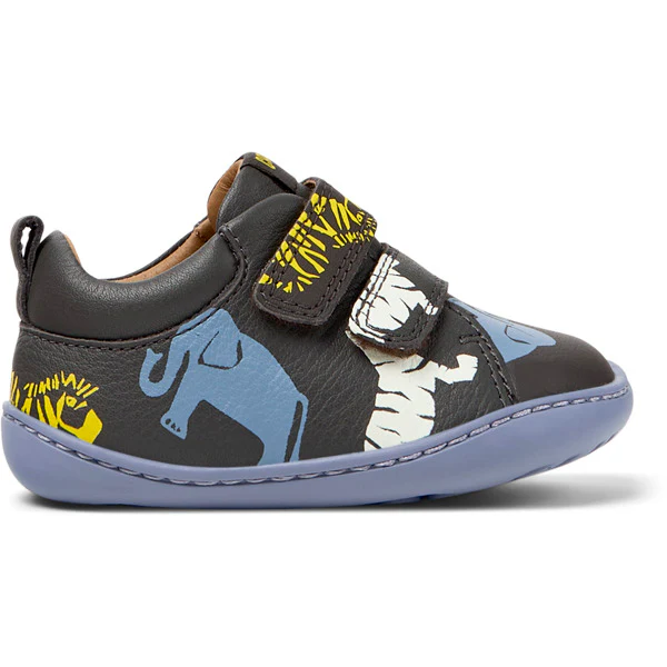 Dessus : cuir Couleur : noir et bleu avec dessins d’animaux bleu ciel et blanc Semelle intérieure : cuir Doublure : cuir et polyester recyclé Semelle extérieure : caoutchouc naturel Fermeture : deux scratchs Usage : utilisation en extérieur Forme ample aux orteils pour un maximum de confort