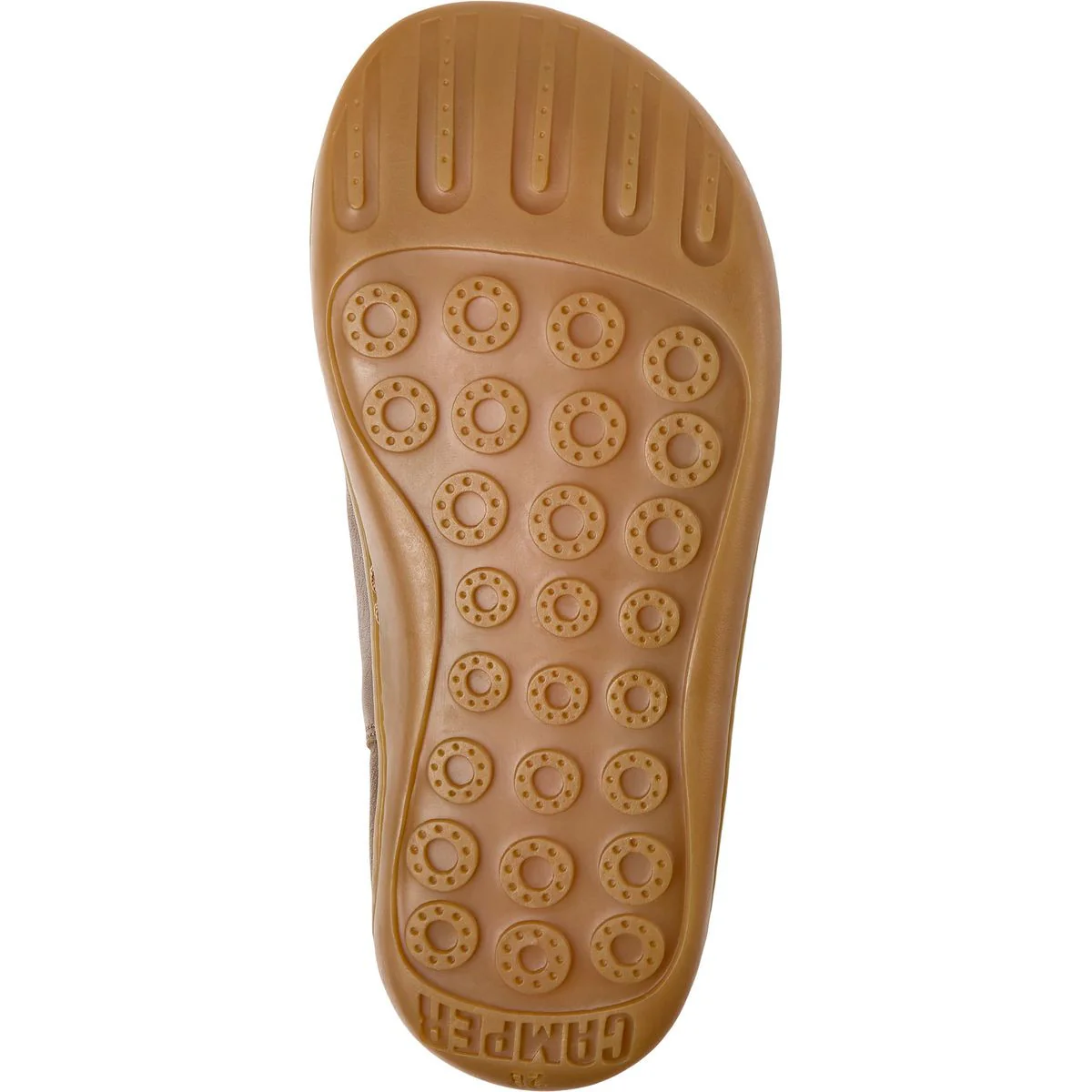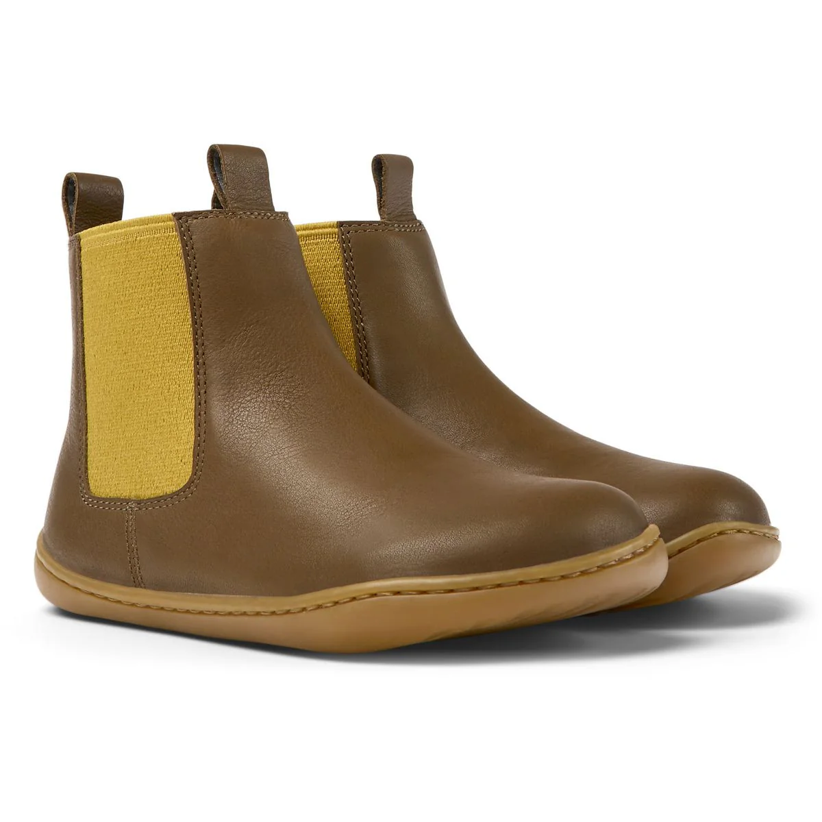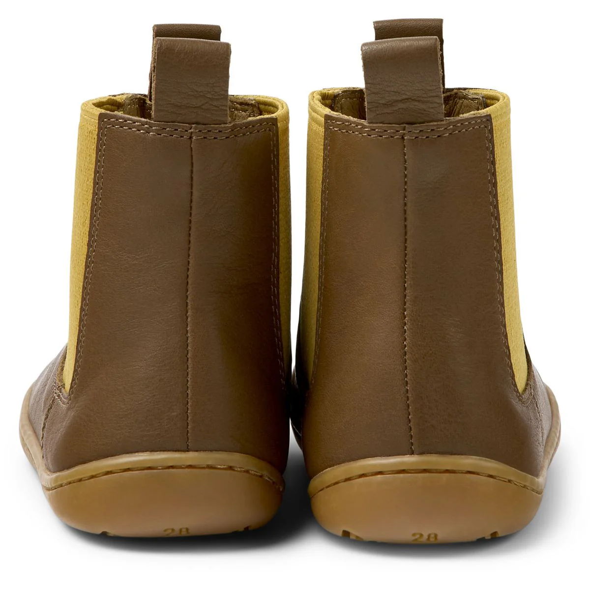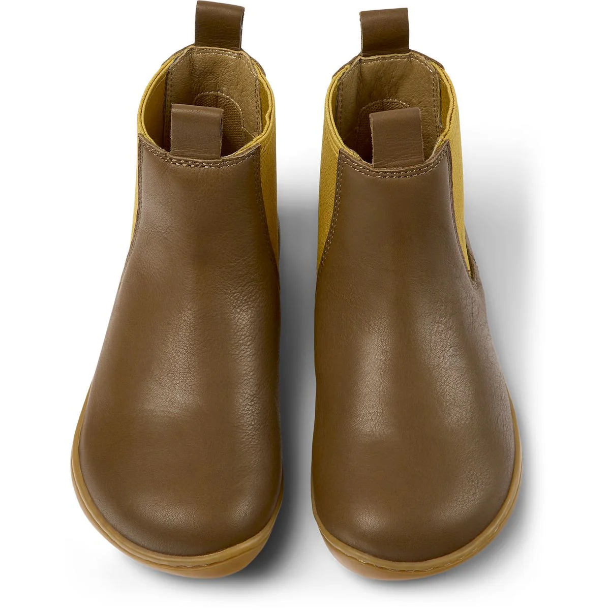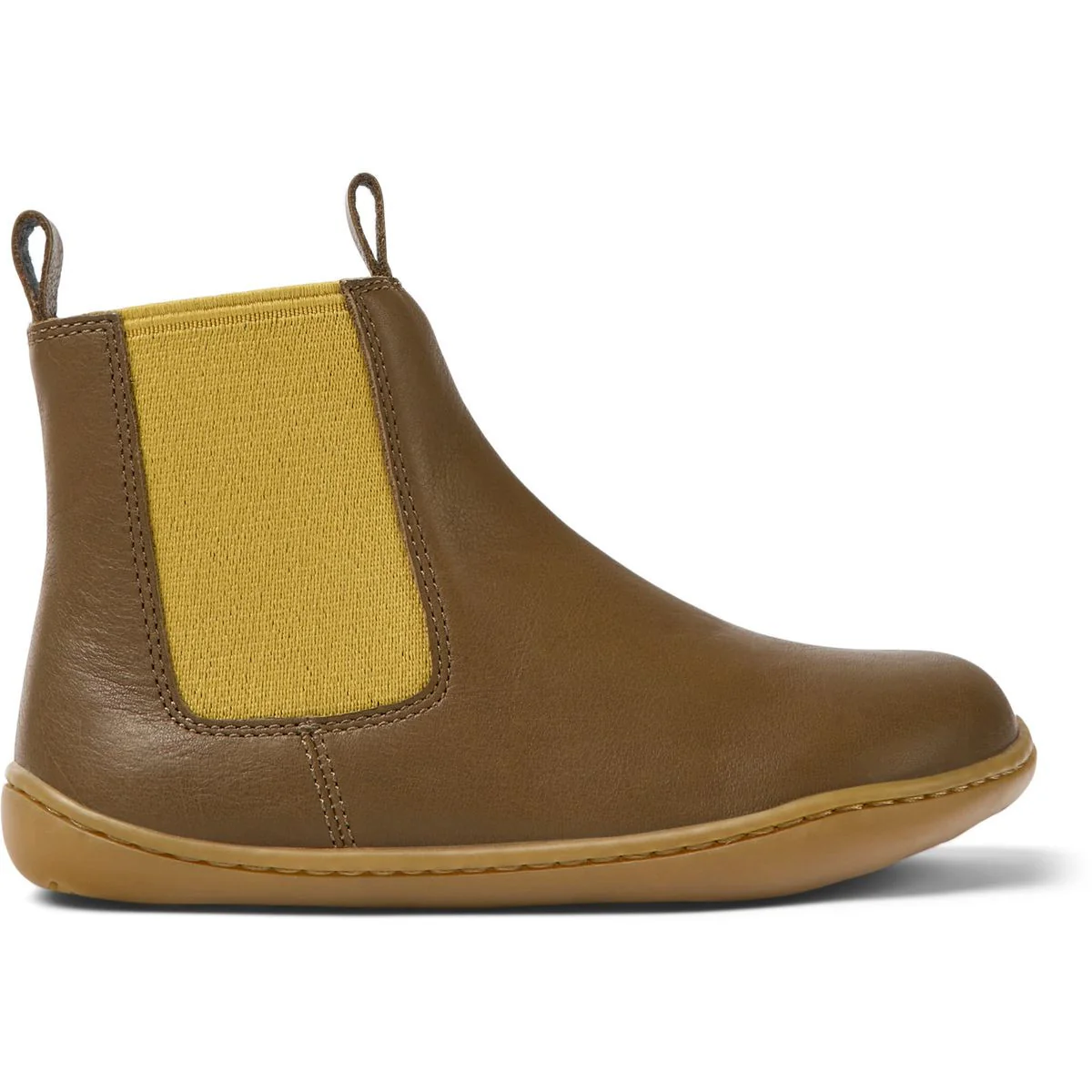 Dessus : cuir Couleur : chocolat, élastique jaune Semelle intérieure : cuir Doublure : cuir/textile Semelle extérieure : caoutchouc naturel (80%) et recyclé (20%) Fermeture : élastique cheville, à enfiler Usage : utilisation en extérieur Forme ample aux orteils pour un maximum de confort