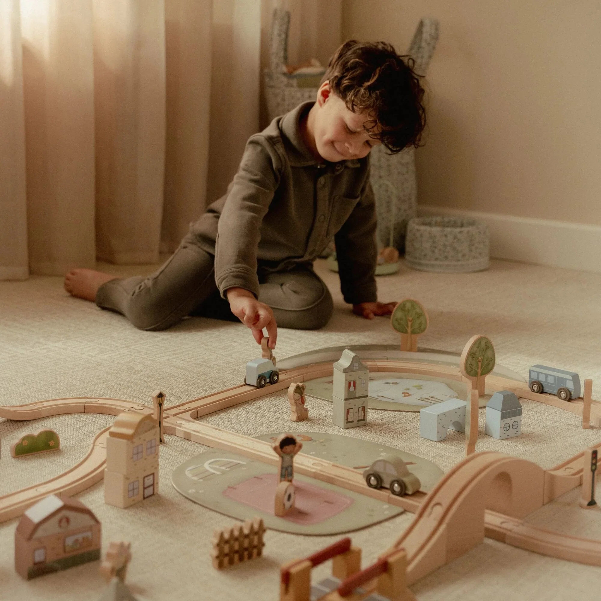 Construis ton propre monde avec le circuit de train en bois XL Little Dutch ! Cet ensemble complet comprend une locomotive, des wagons, des rails, des ponts, des bâtiments, des voitures et des personnages. Il y a aussi des arbres et des panneaux de signalisation. Les possibilités sont infinies ! Fais passer le train sur le pont, arrête-toi à la gare et découvre la ville. Combine le circuit de train XL avec des ensembles d’extension pour rendre le jeu encore plus amusant. Es-tu prêt à monter à bord ?