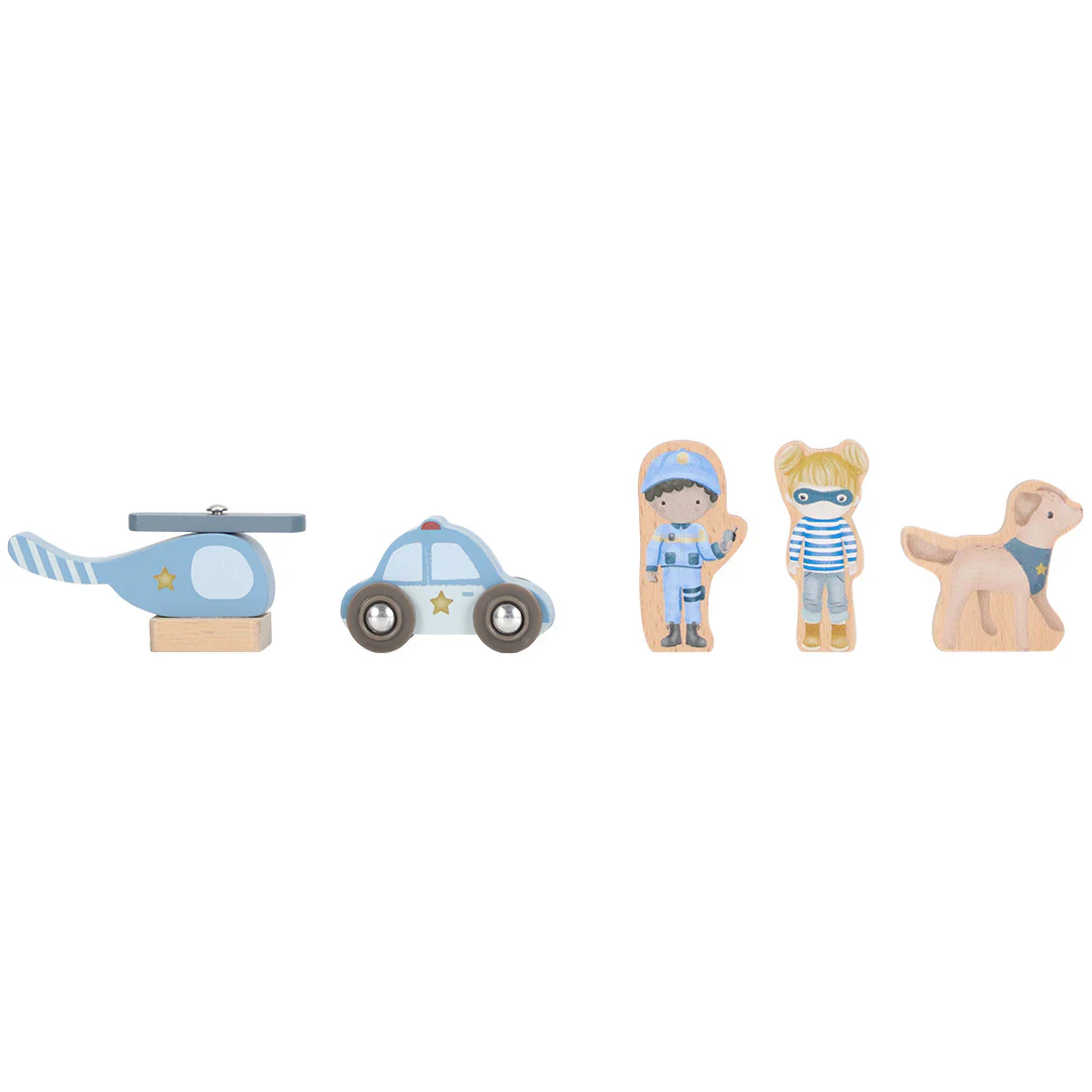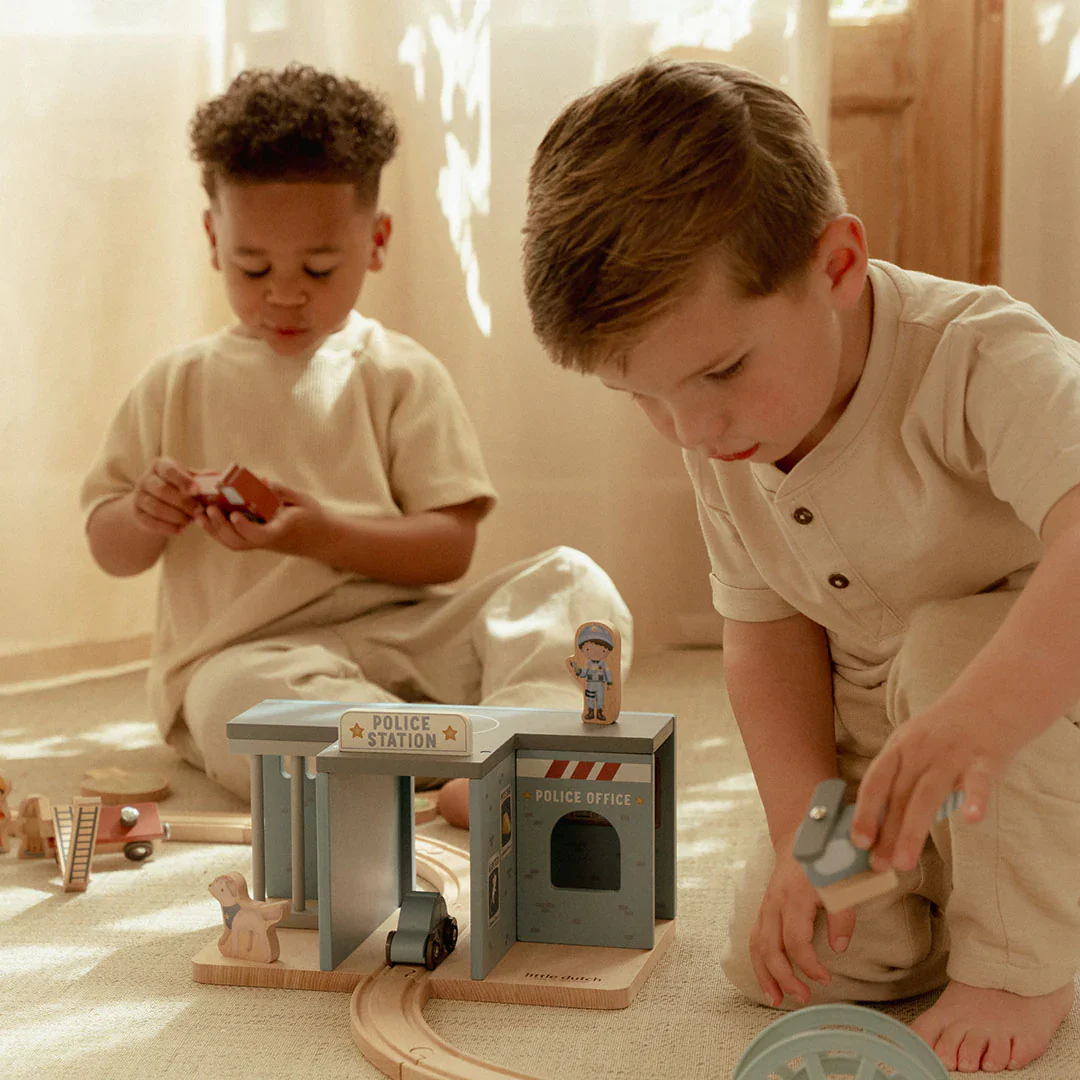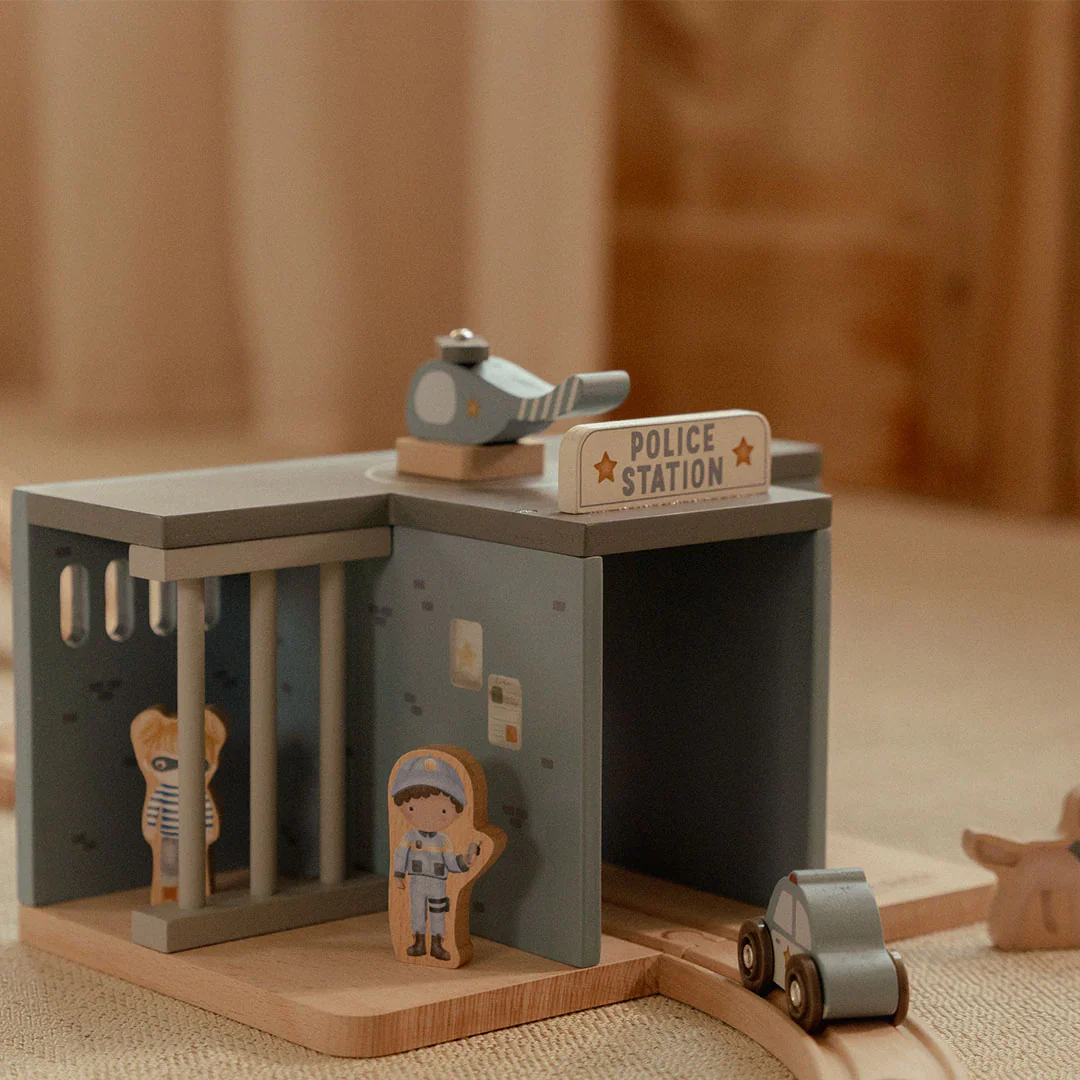 Pars à toute vitesse avec la voiture de police en bois du commissariat et attrape les malfaiteurs avec l’aide du chien policier et de l’agent ! Ce commissariat, de la marque néerlandaise Little Dutch, invite les petits héros à vivre de belles aventures. Embarque aussi avec l’hélicoptère ou la voiture de patrouille pour intervenir en un clin d’œil. Compatible avec d’autres circuits de train pour encore plus de jeu. Un jouet en bois FSC idéal pour les petits assistants pleins d’énergie !