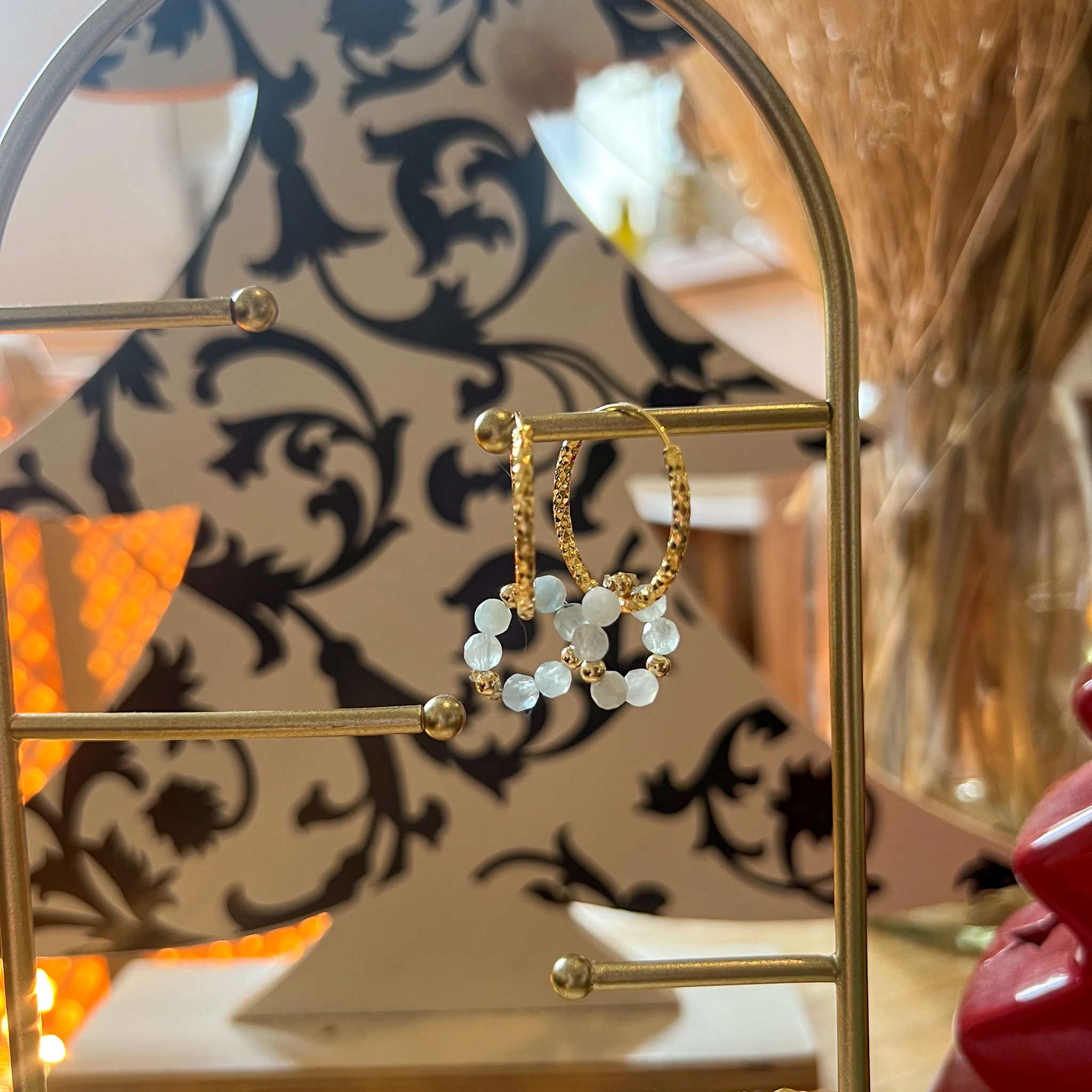 Ces créoles en pierre de naissance minimalistes et personnalisés répondront à toutes vos attentes. Elles sont disponibles en coloris or et présente six belles pierres naturelles espacées de perles dorées. Où chaque pierre représente un mois de l’année et vous confiera tous ses pouvoirs.
