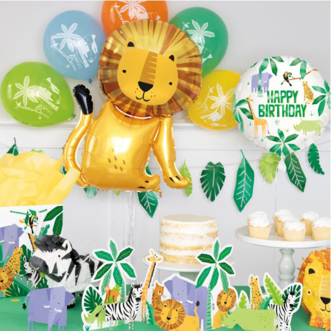 🎉 Lot de 5 décorations 🦒 Animaux de la jungle Crée ton ambiance jungle jusqu’au bout de la table avec ces 5 décorations : lion, girafe, éléphant, rhinocéros, singe, zèbre, tigre, léopard et palmier. A disposer au centre de ta table ou à éparpiller sur ton buffet anniversaire.