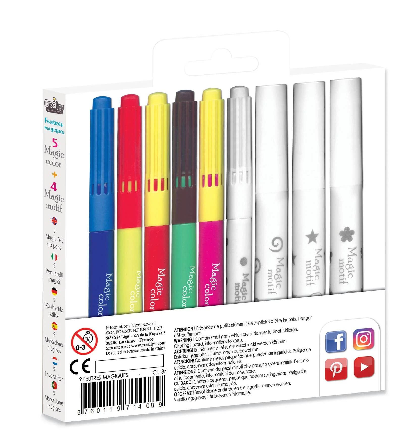 5 feutres de couleurs et 4 feutres « magic motif » pour dessiner tout en s’amusant !