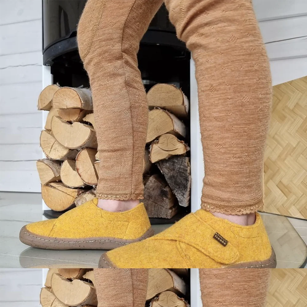 Tout le chausson est doublé de laine feutrée naturelle pour garder les petits pieds au chaud. La laine est un thermorégulateur, les pieds ne transpirent pas. Ces chaussons peuvent être portés avec ou sans la semelle amovible.
