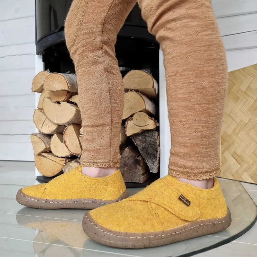 Tout le chausson est doublé de laine feutrée naturelle pour garder les petits pieds au chaud. La laine est un thermorégulateur, les pieds ne transpirent pas. Ces chaussons peuvent être portés avec ou sans la semelle amovible.
