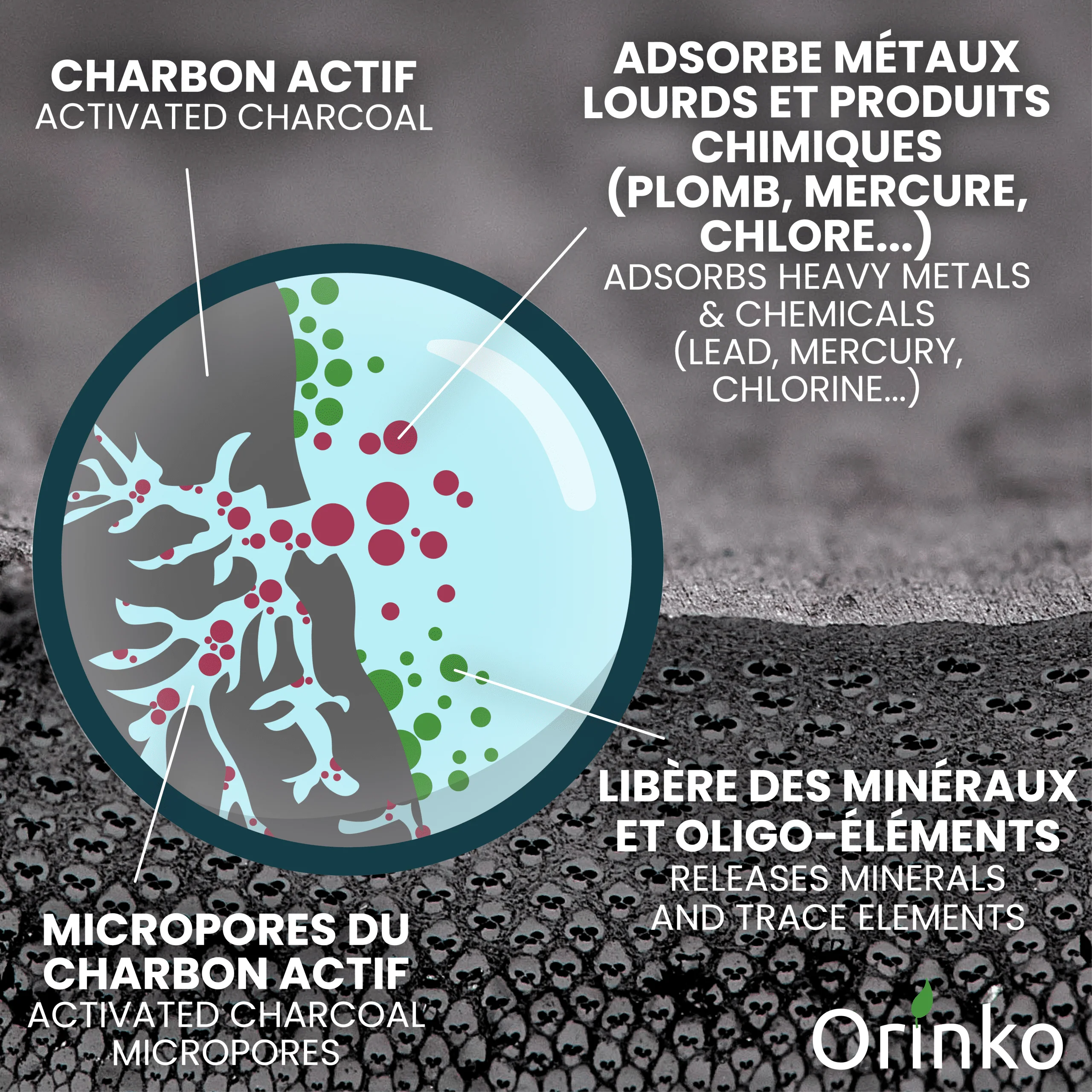 Le charbon possède des propriétés adsorbantes, c’est à dire que les impuretés (plombs, mercure, chlore et autres substances indésirables) présentes dans l’eau viennent se fixer sur les parois des molécules du charbon, afin de les « bloquer » pour éviter que vous ne les ingériez.