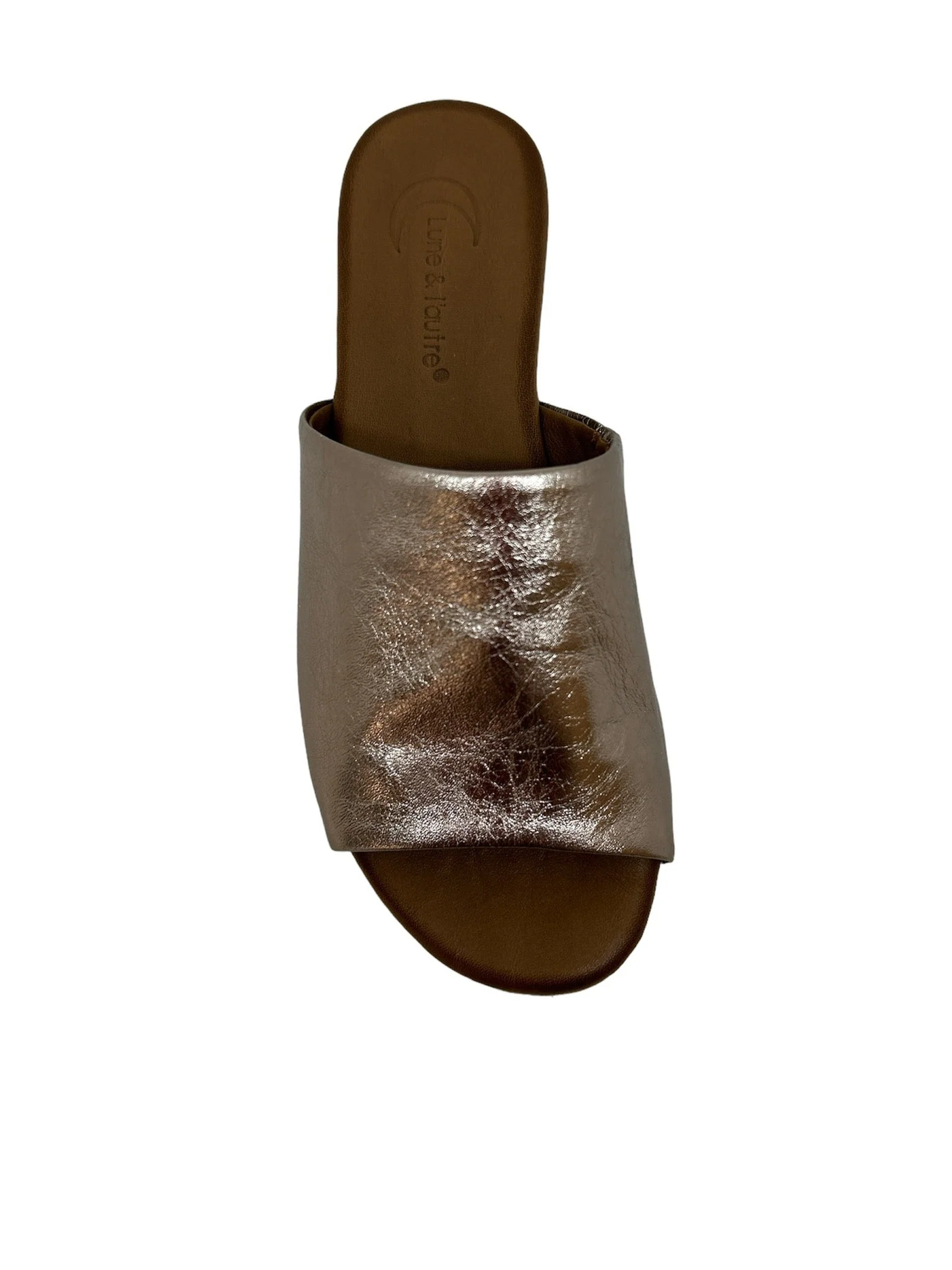 Nu-pieds sandales Forme mule marque LUNE ET L’AUTRE modèle ERNESTINE couleur Bronze tout cuir Lune et l’autre est une marque française chez qui la fabrication de chaussure est une tradition familiale transmise de père en fils. Une qualité de cuir irréprochable et un style moderne qui habillent le pied avec beaucoup d’élégance.