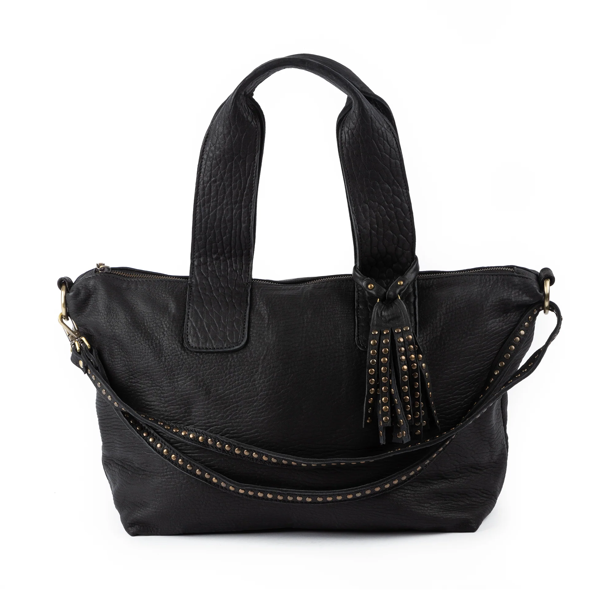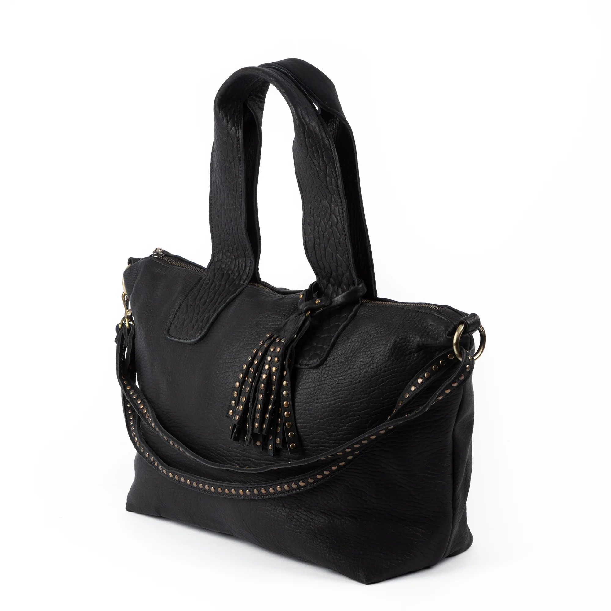Hommage aux Rolling Stones et au Marrakech des années 60, ce sac est en cuir de mouton souple. Il est doté de larges anses en cuir, d’une doublure en lin teinté dans la masse. Les bandoulières sont détachables.