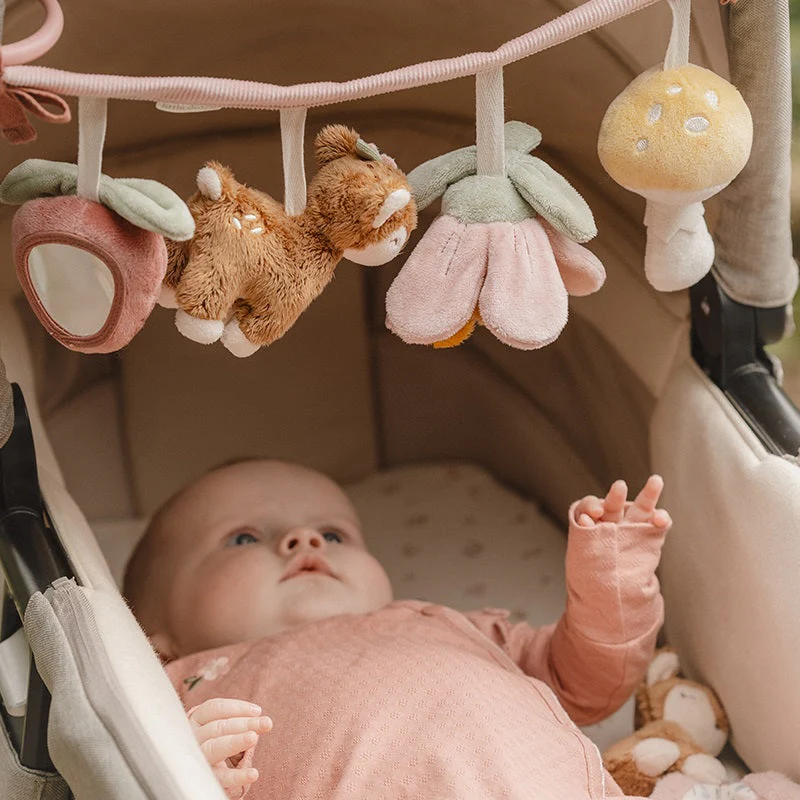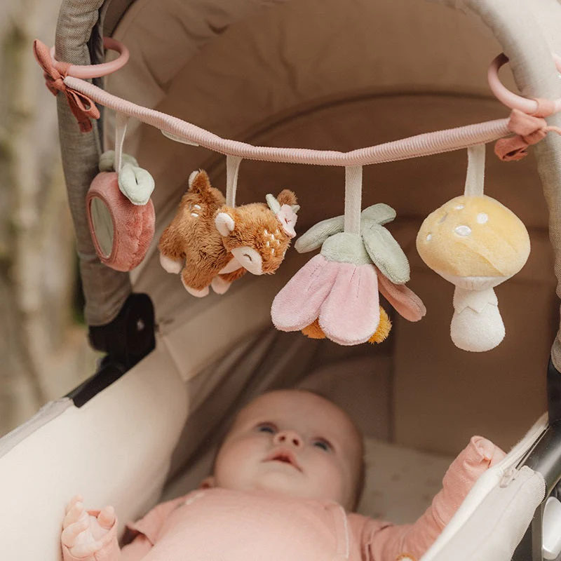 Hochets, couinements, froissements. Découvrez les quatre mignons petits jouets de la collection Fairy Garden sur cette chaîne de poussette. L’adorable cerf, la fraise, le champignon et la belle fleur sont là pour vous divertir pendant votre promenade. Offrez à votre enfant une expérience sensorielle avec cette chaîne de jouets colorée pour poussette, en encourageant le développement de la coordination main-Å“il lors de vos déplacements. La chaîne de jouets s’attache facilement à la poussette. AVERTISSEMENT : Pour éviter que l’enfant ne s’emmêle et ne se blesse, retirez ce jouet lorsqu’il commence à marcher à quatre pattes. À assembler par un adulte.